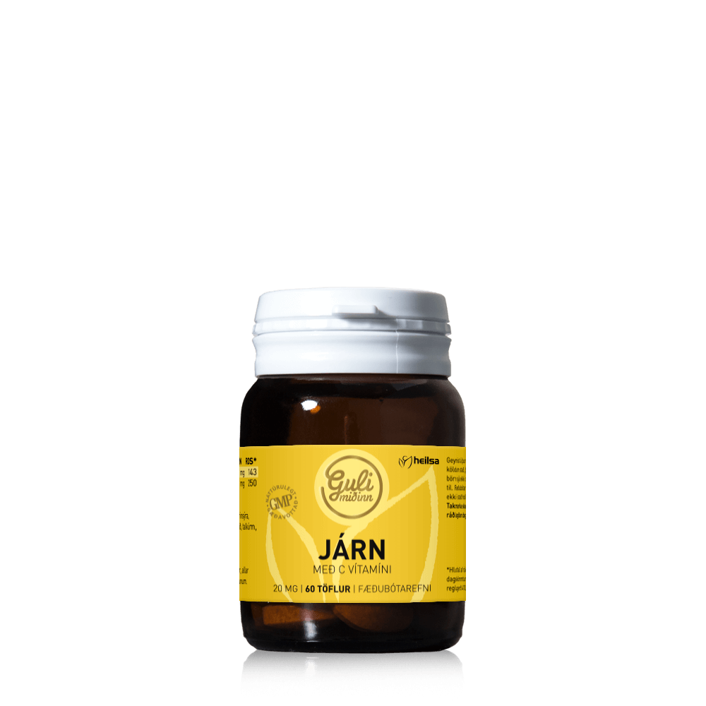 „Það er algengt að fólk fái í magann af járntöflum, þær eru mismunandi samsettar og missterkar. Ég mæli 100% með járntöflunum frá Gula miðanum. Ég hef aldrei fengið magaverk af þeim. Það er líka C-vítamín í þeim sem gerir það að verkum að járnupptakan verður enn betri.“
