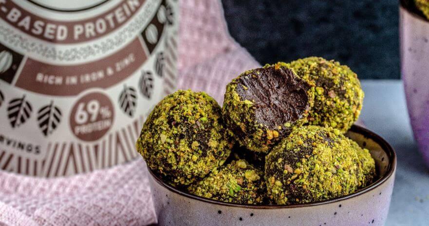 - Taktu nú skálina úr frystinum, notaðu skeið til að veiða upp deigið og mótaðu úr því kúlur (stærð eftir smekk). Veltu hverri kúlu upp úr pistasíumjölinu og raðaðu þeim á bökunarpappírsklæddan disk eða bretti